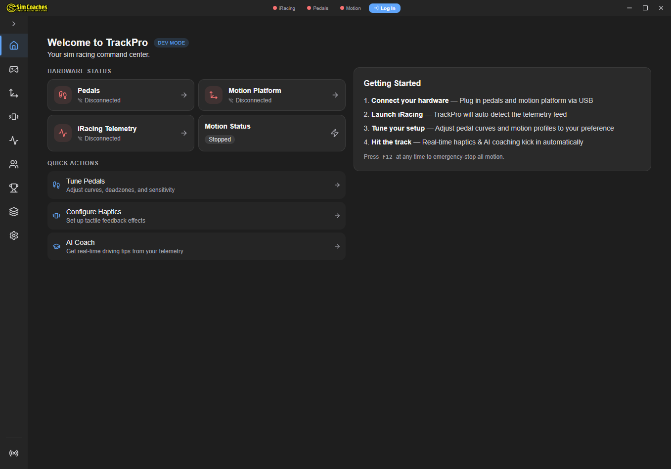 Telemetry. AI Coaching. Pedal Tuning. Haptics. 5DOF Motion. Cross-Game Config Sync. All in one app.